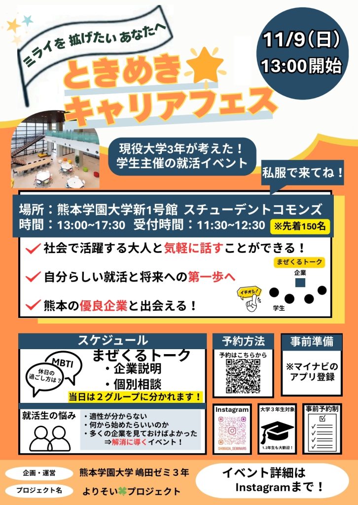 このたび、熊本学園大学 嶋田ゼミ3年生により主催される、就活イベント「ときめき キャリアフェス」に弊社が出展いたします。