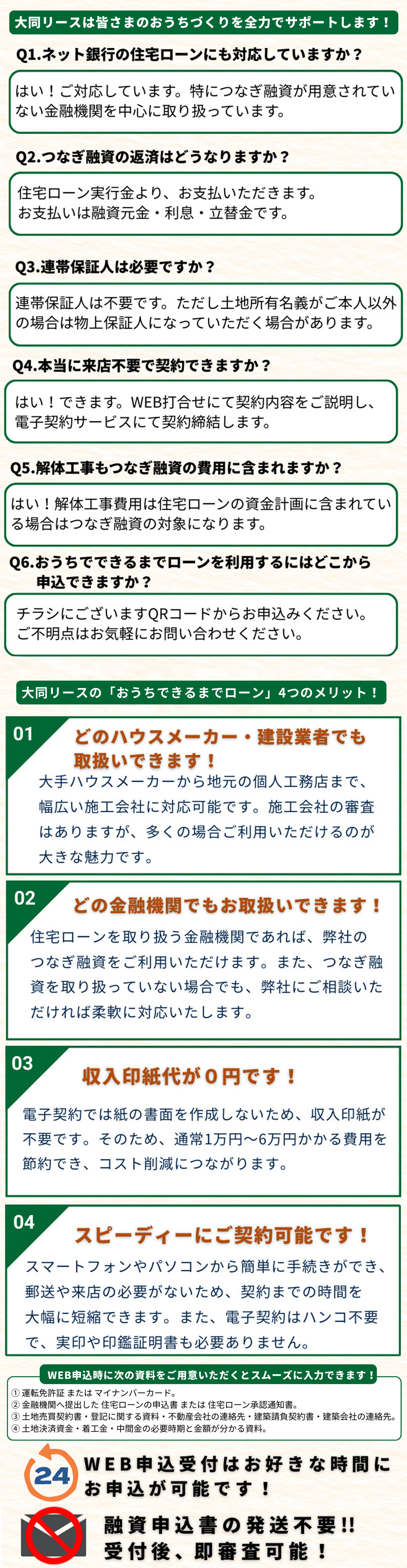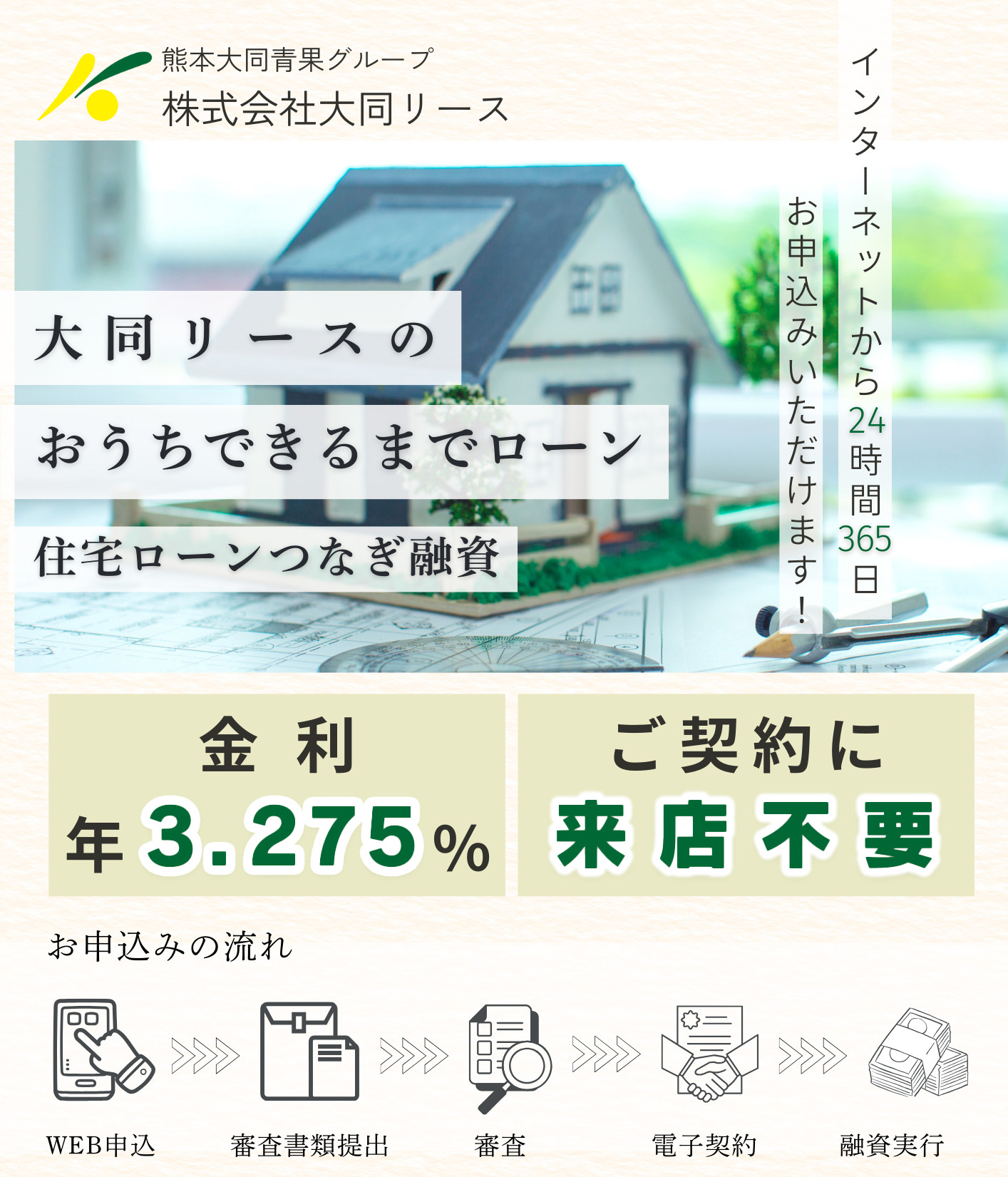 審査書類 | ・金融機関が発行する住宅ローンの融資承認証明書 ・収入証明書類(源泉徴収票、住民税課税証明書、納税証明書等) ・運転免許証またはマイナンバーカード等の、本人確認資料 ・土地の不動産登記事項証明書、公図、地積測量図、住宅地図等 ・建築工事請負契約書、土地売買契約書、重要事項説明書等 ・その他、当社が必要と判断するもの |
